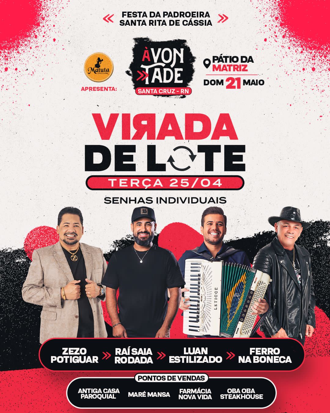 A festa social de Santa Rita de Cássia promete grande público no pátio da Matriz, dia 21 de maio, e terá muitos sucessos ao som de Ferro na Boneca, e Raí Saia Rodada, Zezo Potiguar e Luan Estilizado com o show “À Vontade”.