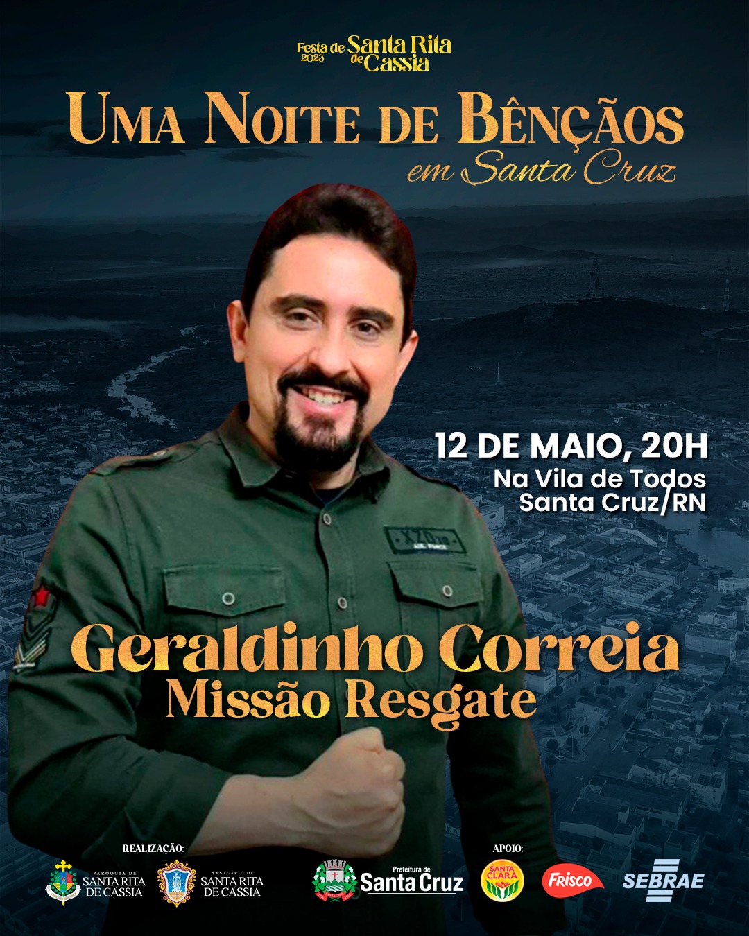 “Uma Noite de Bênçãos”, é assim que a Paróquia de Santa Rita de Cássia, em Santa Cruz, vai começar a festa da sua padroeira, com um evento de louvor e adoração, no complexo da Vila de Todos, às margens da BR-226, no dia 12 de maio, sendo a grande atração o missionário e pregador Geraldinho Correia, da comunidade Missão Resgate.