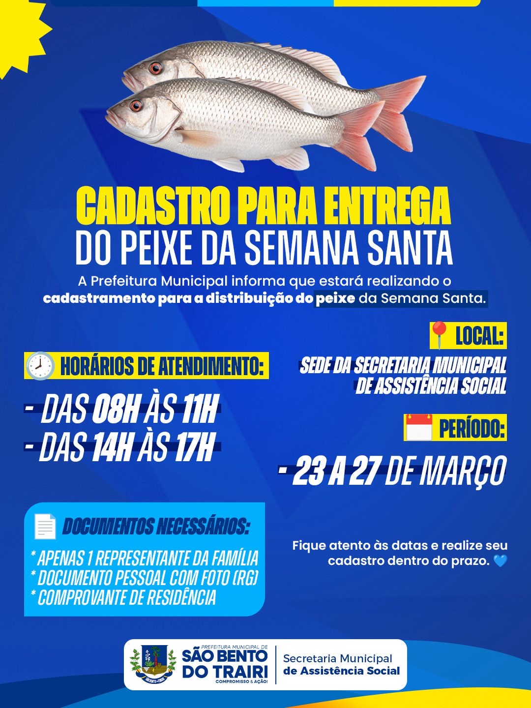 A Prefeitura de São Bento do Trairi iniciou o período de cadastramento para as famílias que desejam receber o peixe distribuído durante a Semana Santa. A ação é coordenada pela Secretaria Municipal de Assistência Social de São Bento do Trairi.
